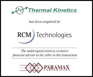 Paramax advised Thermal Kinetics Engineering, PLLC and Thermal Kinetics Systems, LLC (collectively “TK” or the “Company”) on the sale to RCM Technologies (USA), Inc. TK is a key technology and development partner who provides engineering services and equipment contracting for construction, industrial processes, and industrial processing facilities. Utilizing its extensive library of patents, trade secrets and knowhow, the Company engineers and builds optimal thermal integrations and unique separations approaches for industrial processes and equipment. Paramax served as the exclusive M&A advisor to TK on this transaction.